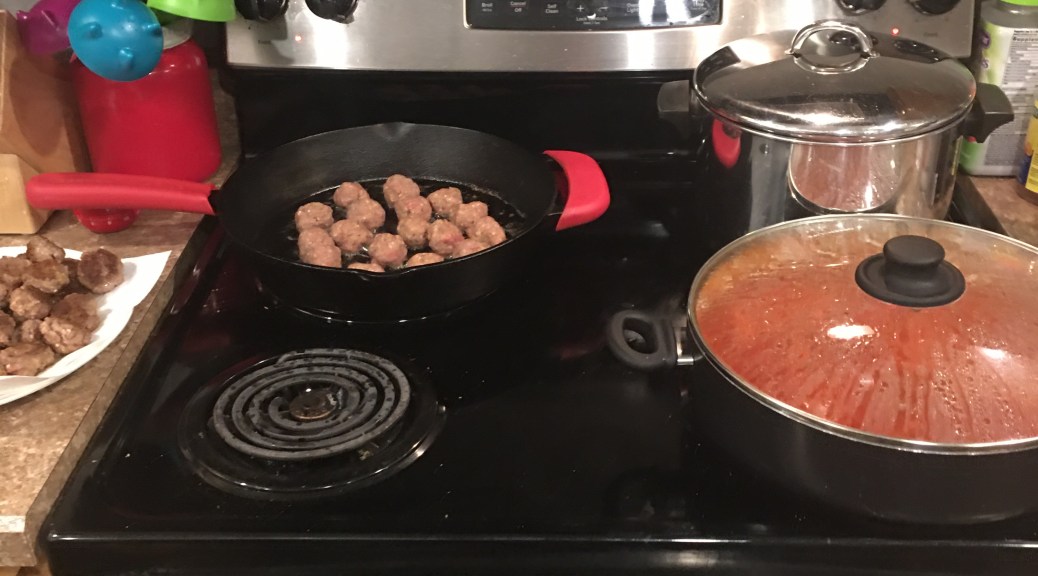 This is recipe # 7 so far. Rigatoni & Meatballs. Serves 6-8…we will be eating the is a while. A new recipe of meatballs from scratch…I have one, but this is more complex.