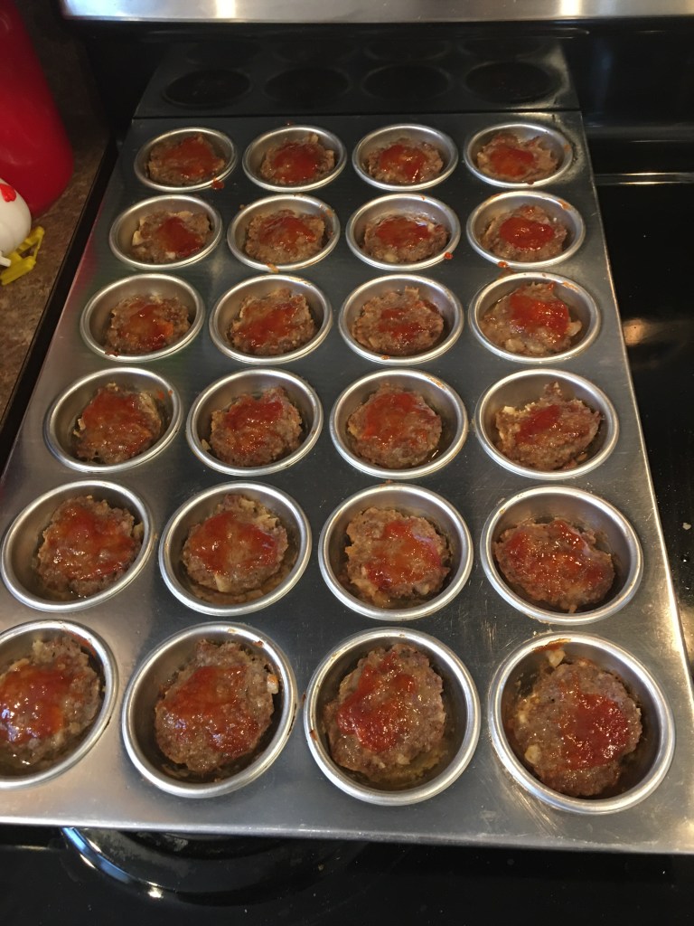 The recipe is Asian Mini Meatloafs. You make it in a muffin pan. It made a total of twenty-four mini loaves. Enough to last the hubby through his work shifts.