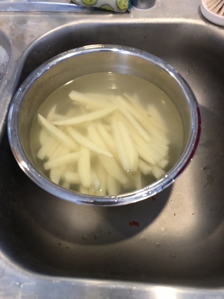 Yep that’s right. I decided to be ambitious…French fries it is…but not only that, I’m going to fry them!! I normally bake them in the oven, but since the oven is being used and now I find frying interesting, let’s try it!