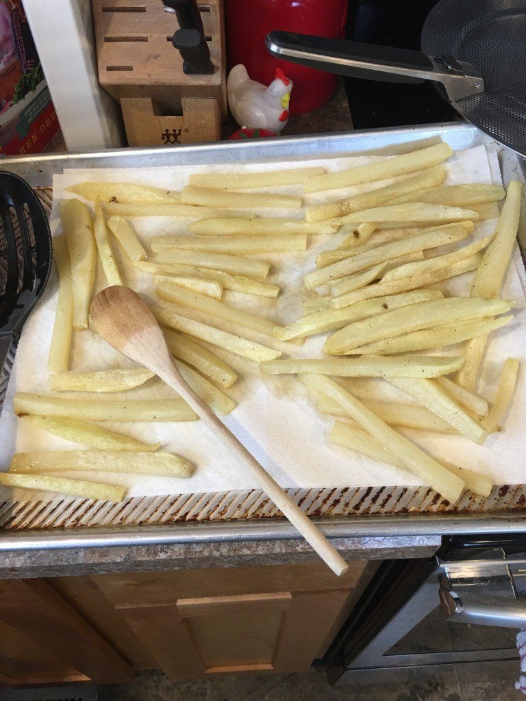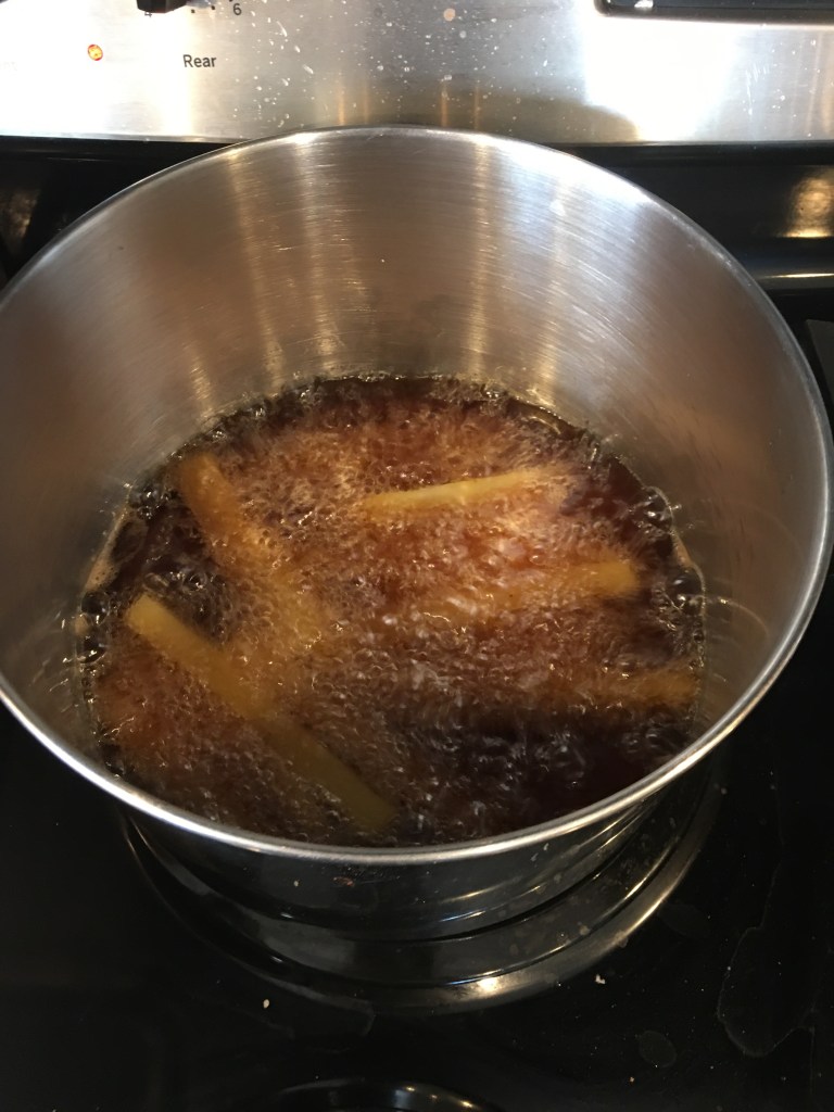 So because my knowledge of frying is still small I looked up a fries recipe on google. It was Chef John’s French Fries. I only referenced the temp of the oil and how long. Just because I wanted them to be plain because we already have enough salt… but also I plan to eat them with lots of ketchup!