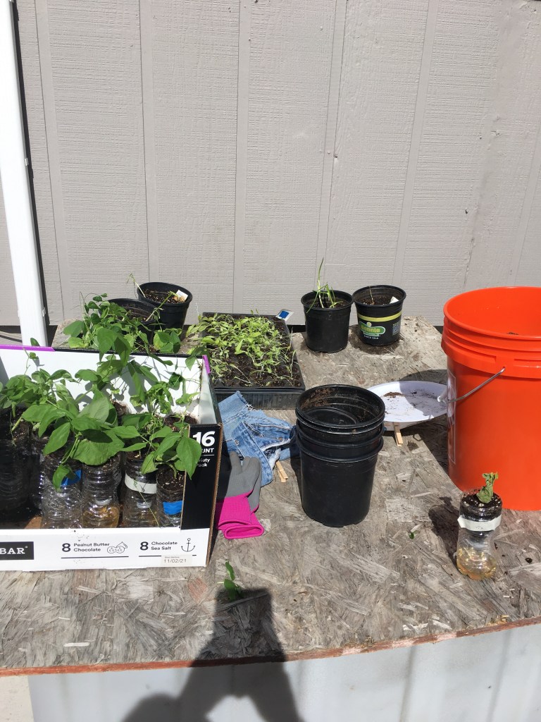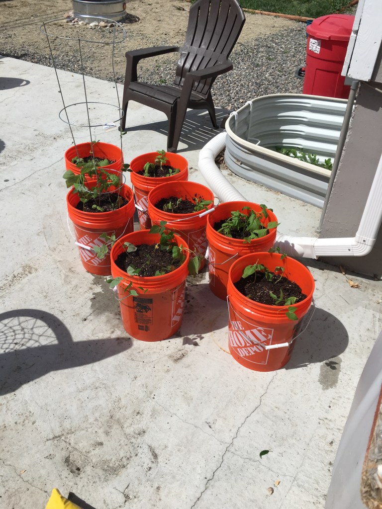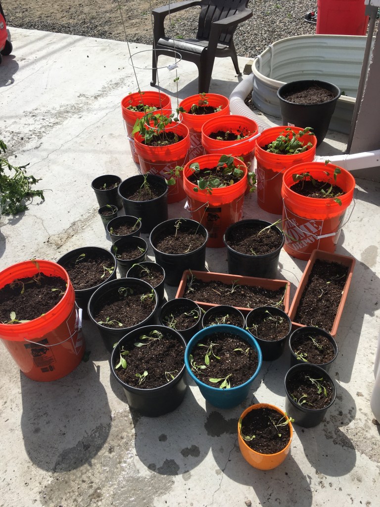 But this post is about the transplanting from the starter seeding to the main pots. We were going to build big garden boxes this year but the snow would never go away, and the building materials have become unreasonably priced…so we opted for Home Depot buckets. Also for all my romaine lettuce, that I started from tiny seeds, I will be using various pot sizes that we already have. Because I originally planted seventy-two lettuce plants.