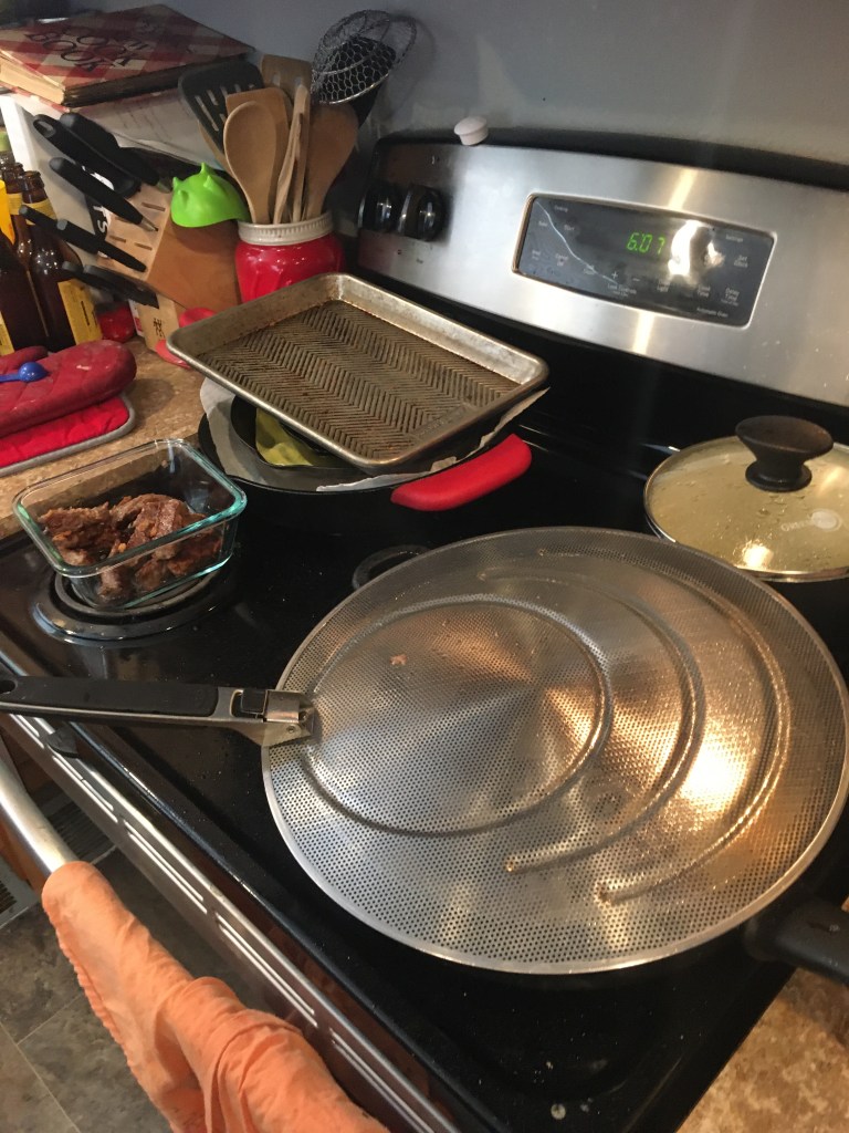 I will say. I know understand why you use a wok. It’s tall, deep, and the oil that explodes won’t burn you. I got burned. Not bad, but wow did it make a mess. This was my solution…