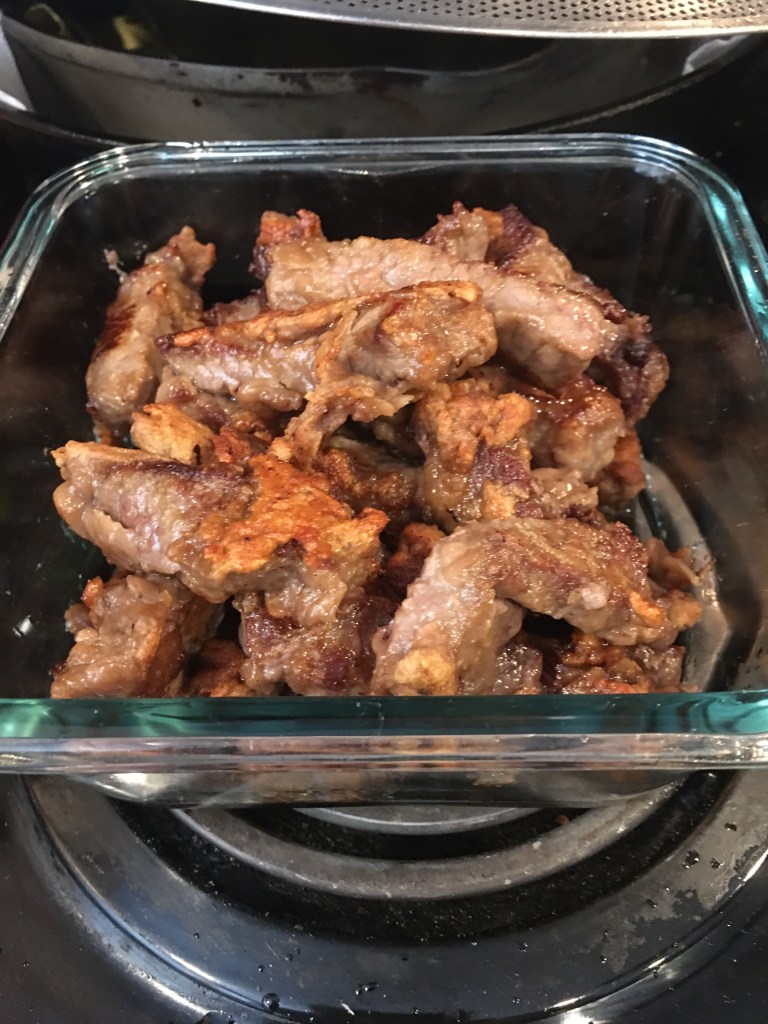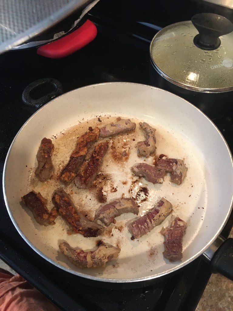 To sum it up: I used round steak; because that’s what I had. I thawed and sliced it in strips along the grain. I marinated it in 1 TBsp of soy sauce for 10-ish min. I then added and coated the meat with 6 TBsp of flour. It called for cornstarch, but I never have cornstarch. Then I prepared the pan for frying.