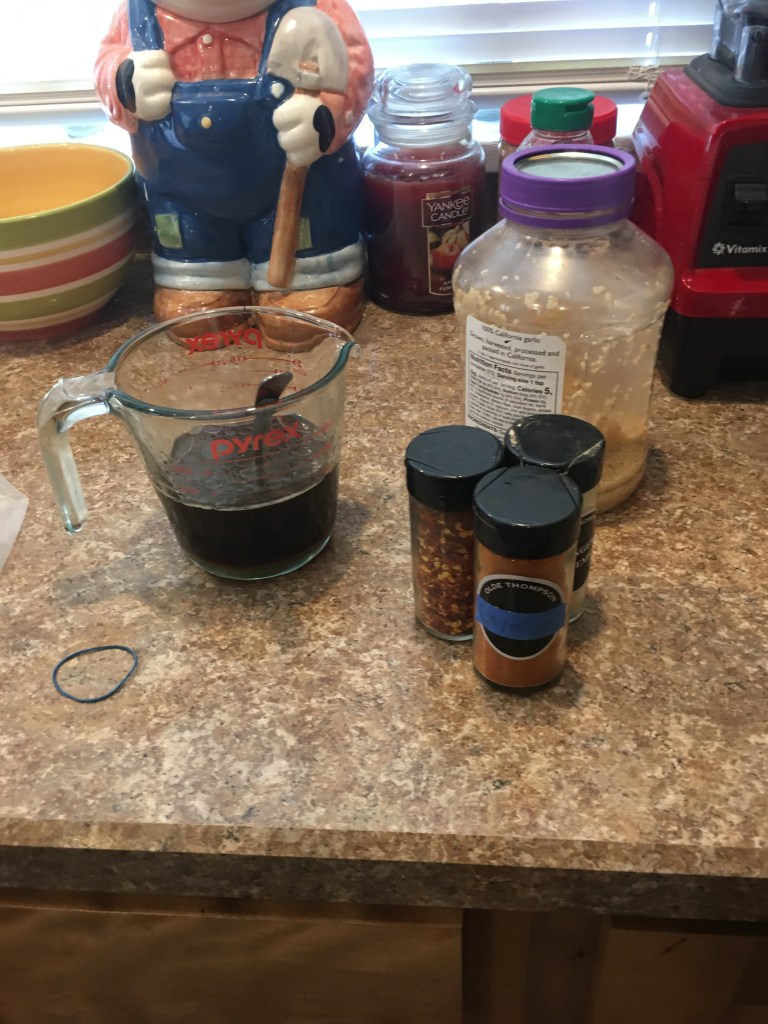 The recipe called for red peppers. Which of course we don’t have and I don’t want to go to the store. Mostly because I am in my pjs already. So instead I used cayenne pepper. I only put 1/2-3/4 tsp. I didn’t really measure. I just sprinkled it; we will see how spicy I made it!