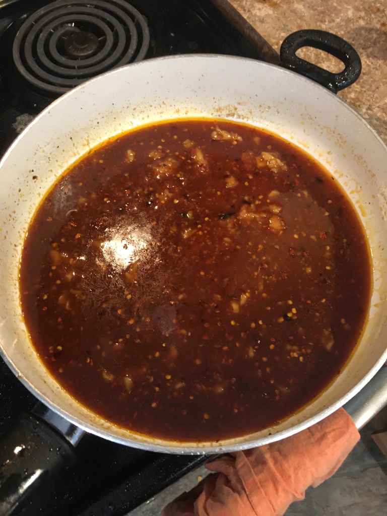 I realize this picture looks the same as the one above but I added the watered flour mixture. (Most people use cornstarch) but if you can see those small clumps in the top center…that is flour that cooked and formed a lump. I tried to whisk it in…it wouldn’t so I… just scooped them out and then…