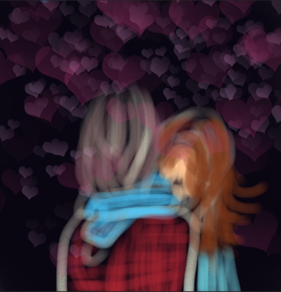 “Nope. I’m right here,” Dad came around a corner, “I’m not about to let you leave without saying goodbye. Dad kissed Mom on the forehead, “Love you. Have fun, Hon.”