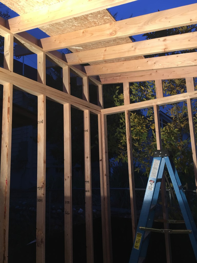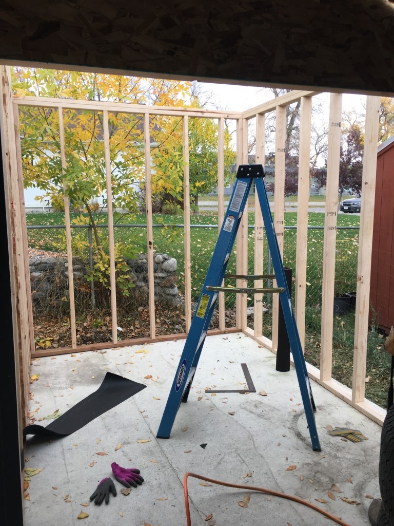The garage is 8ft x 10ft x 10ft. As the hubby was framing it, I was inside eating lunch with the baby. She was being a troublemaker.