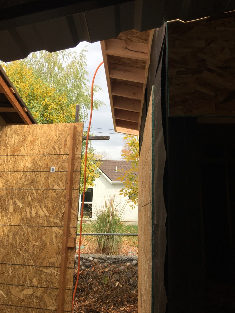 The space between the shed and garage is about 5ft. So with both overhang there is about 3ft of empty. We might stack wood here; under the garage overhang.