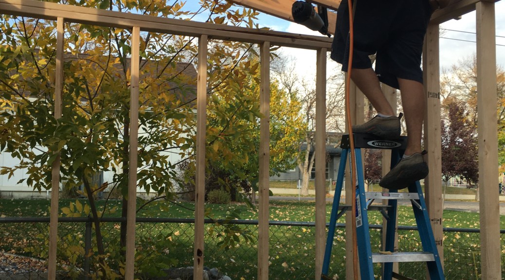 I helped with the rafters. I handed them up to him, and he did all the hard stuff. I was pretty much just a pair of helping hands. Also maybe the mascot.