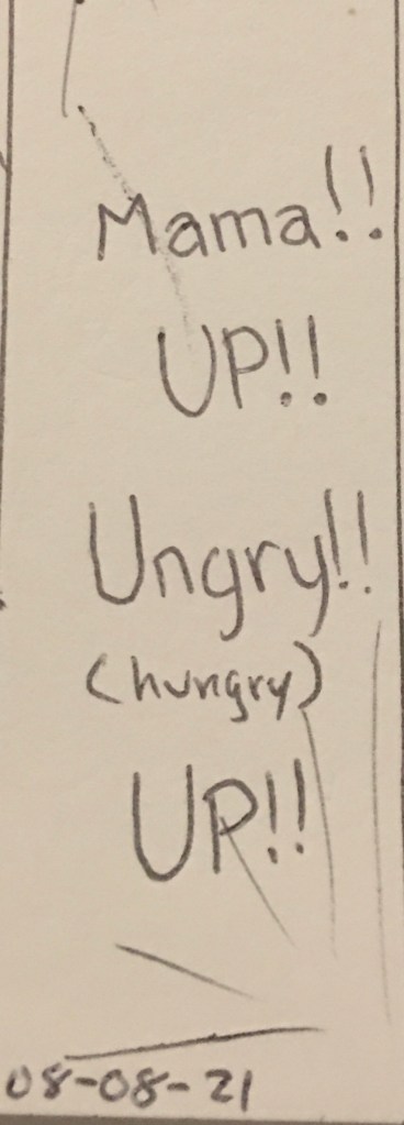 …Mama is peacefully sleeping. Not dreaming just sleeping! In the darkness…”mama…mama…”Hmmm? …??…no…Please no…no…CLICK!Light! Blahhhhh!“No Eli. Turn it off!”She was tanking the pillow off my face as she yelled at me. I knew it was early…but not that early…ugh…Mama is not happy…😒